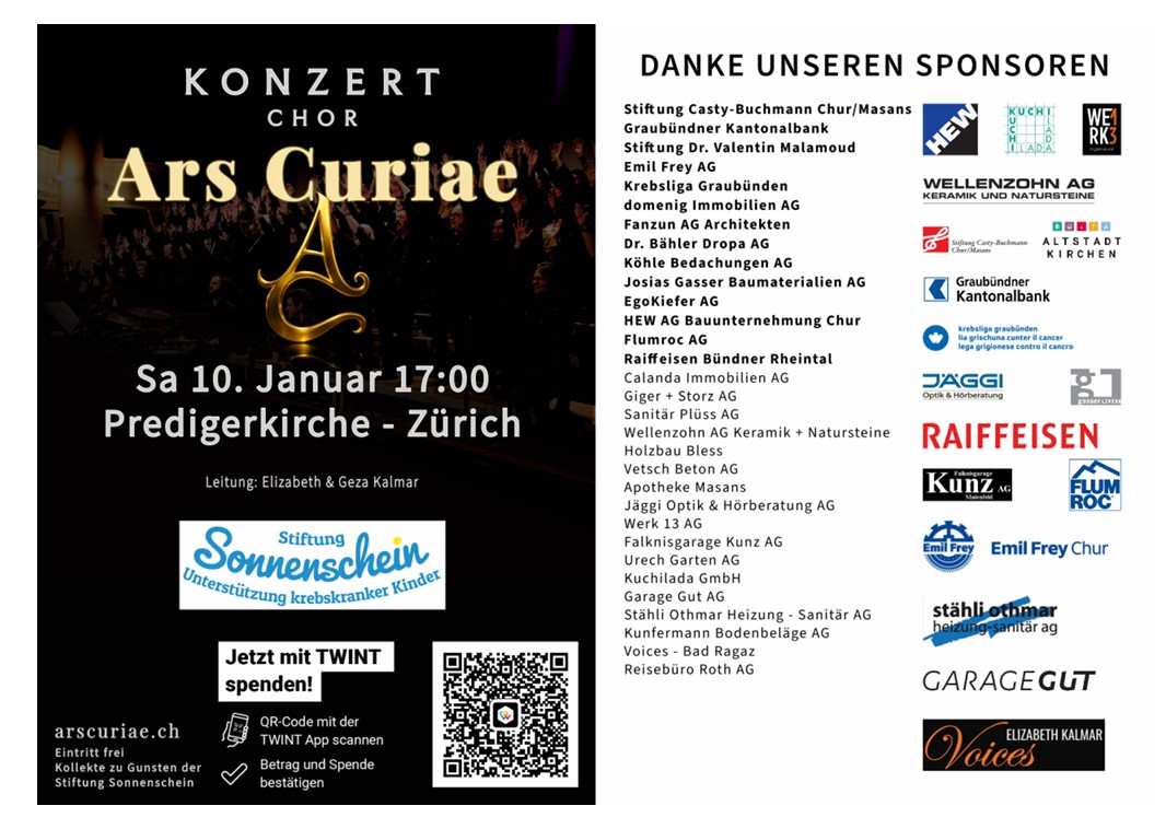 Viele kennen es längst, allen anderen legen wir es sehr an Herz: Das Benefizkonzert vom Churer Chor «Ars Curiae». Jahr für Jahr begeistern die fast 90 Sängerinnen und Sänger ihr Publikum mit einem breiten Repertoire aus den unterschiedlichsten Stilrichtungen von Pop bis Gospel (www.arscuriae.ch), begleitet von einer professionellen Band.